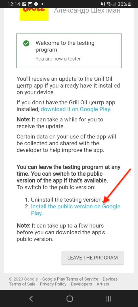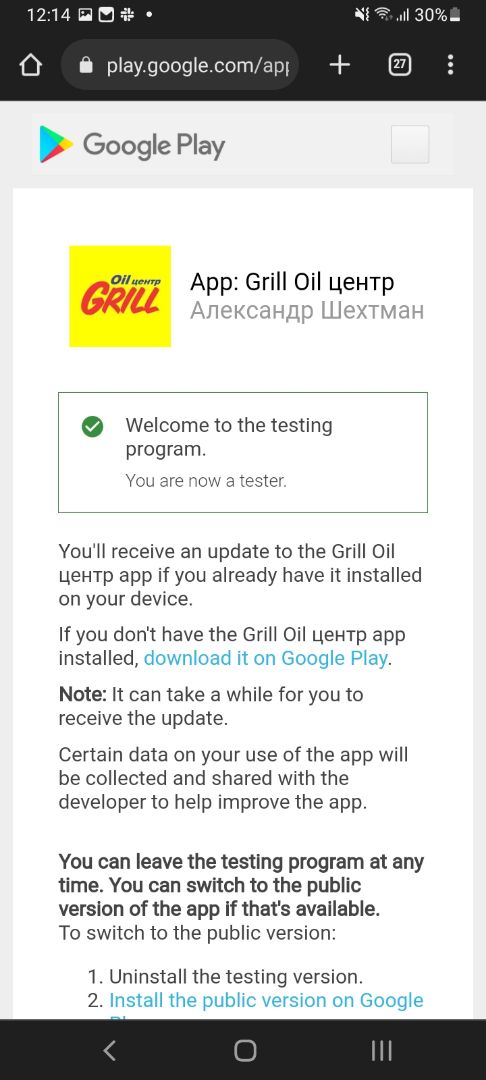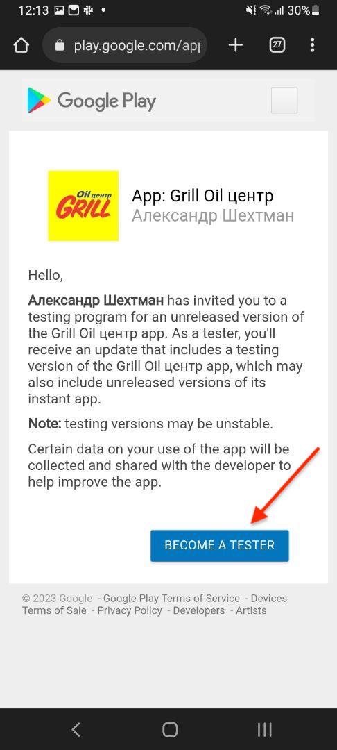 - У Вас откроется страница с согласием на тестирование приложения, Вам необходимо нажать кнопку "Become a tester"